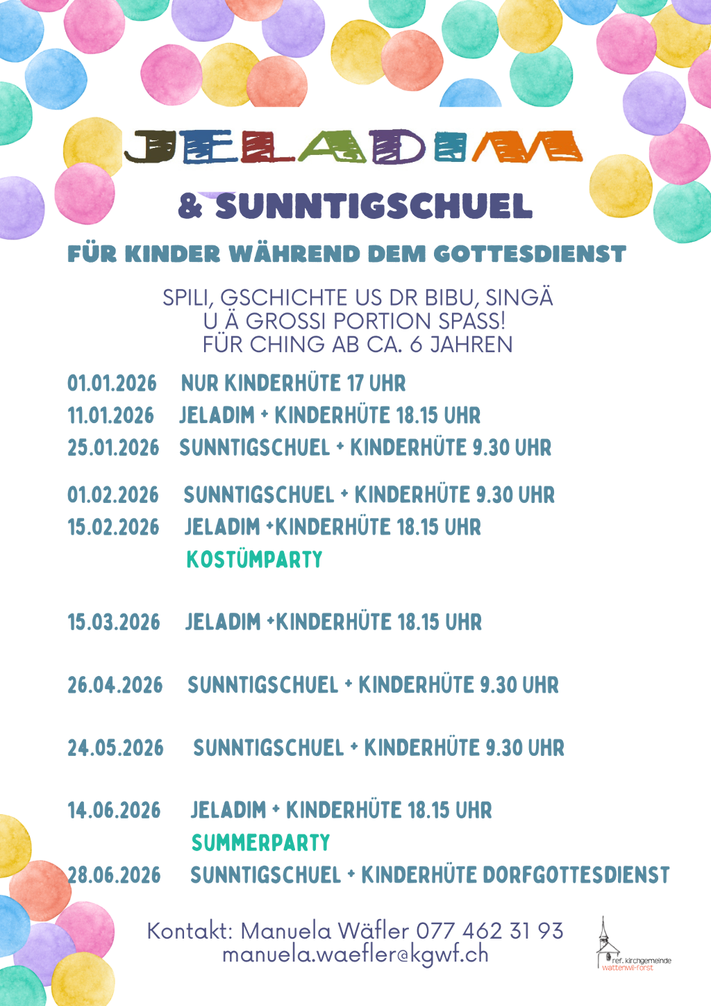 Spili, Gschichte us dr Bibu, singä u ä grossi Portion Spass! Das isch ds JeladimEs findet im Kirchgmeindhuus Wattenwil statt u isch es Agebot für aui Kinder im Alter ab ca. 6 Jahren.